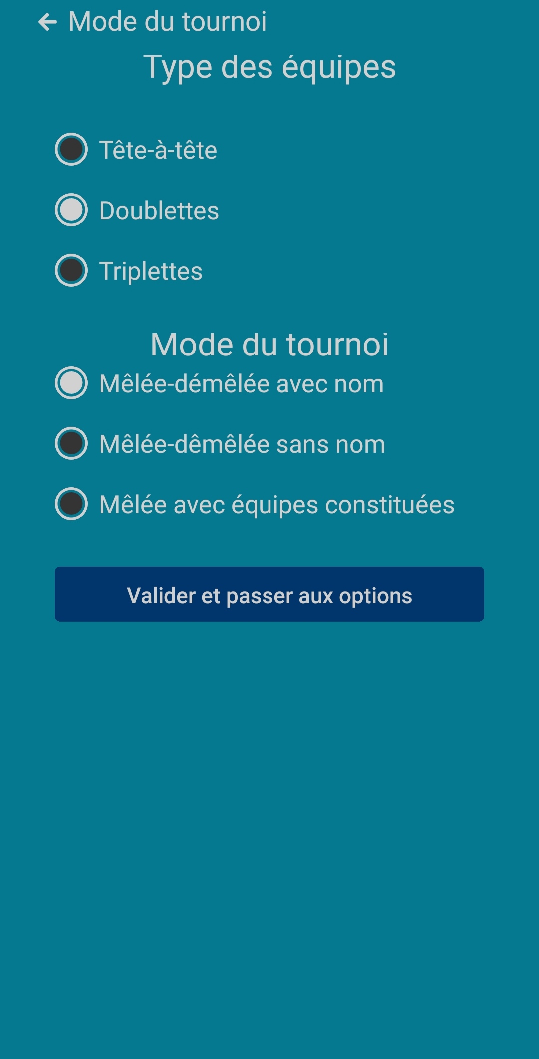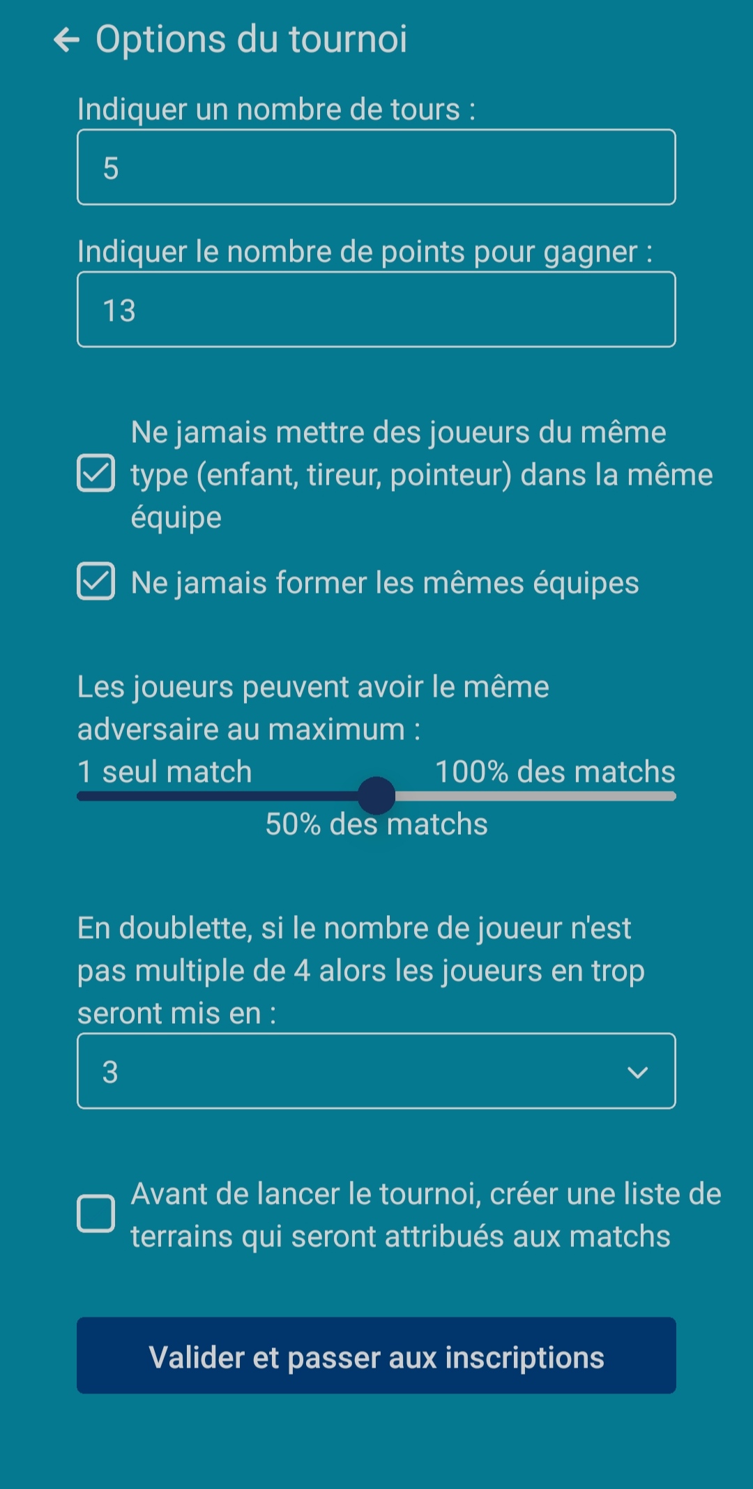 De nombreuses options sont disponibles, mode et type de tournoi, règles de mélange des équipes, nombre de tours et de points pour gagner un match, etc